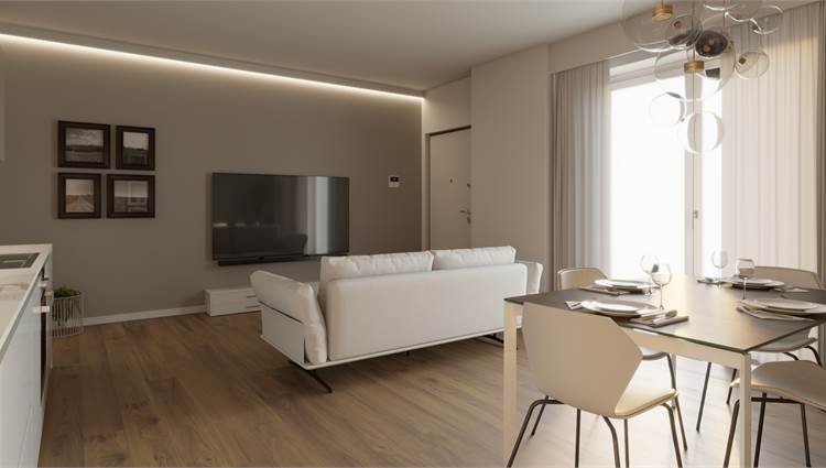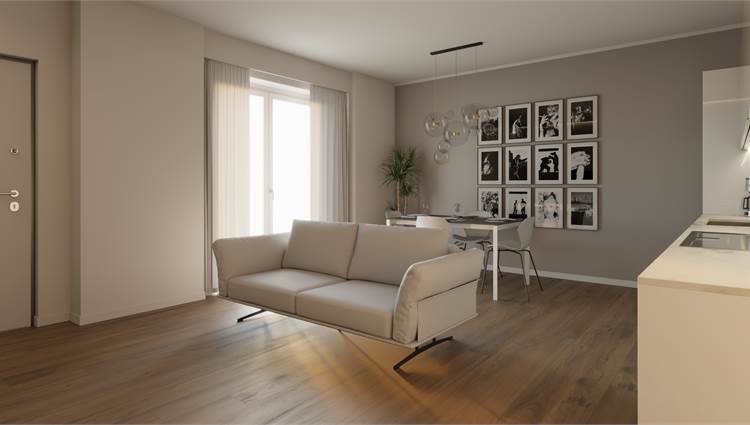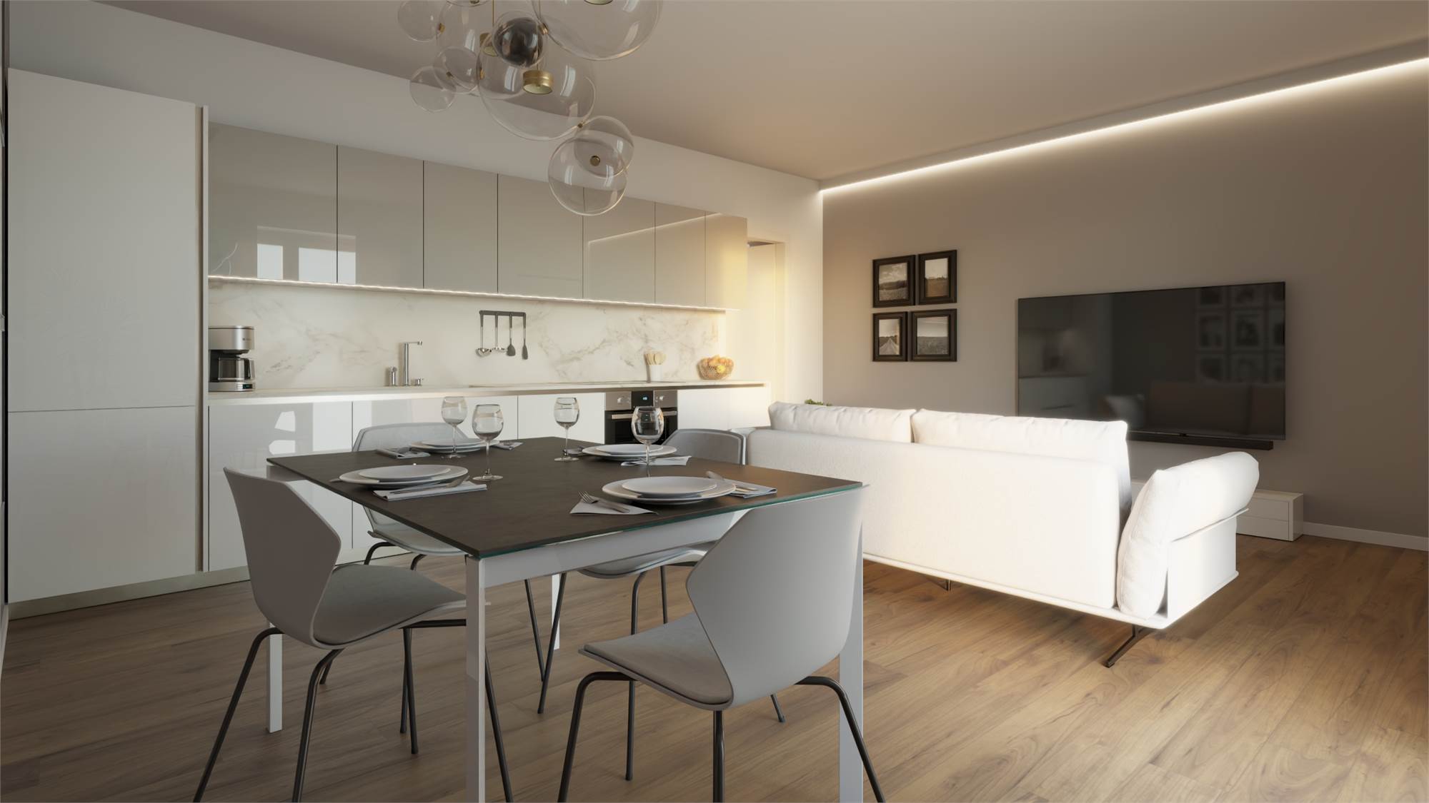 Ingresso su luminoso soggiorno con cucina a vista, pensato per unire comfort e convivialità;
