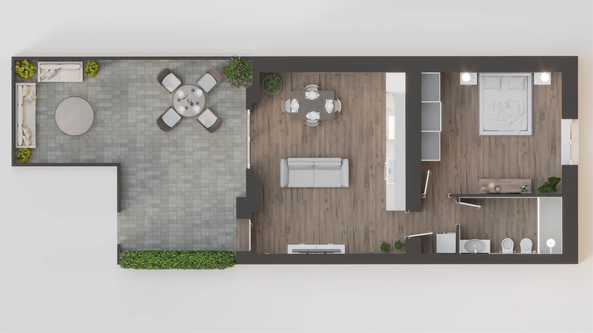 Ogni unità dispone inoltre di una porzione privata di cortile interno, perfetta per momenti di relax o per tenere una bicicletta in sicurezza.